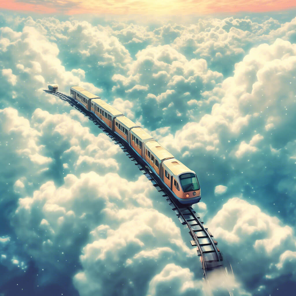 - Fantasy sky train passing above the clouds, magical realism, Hayao Miyazaki style