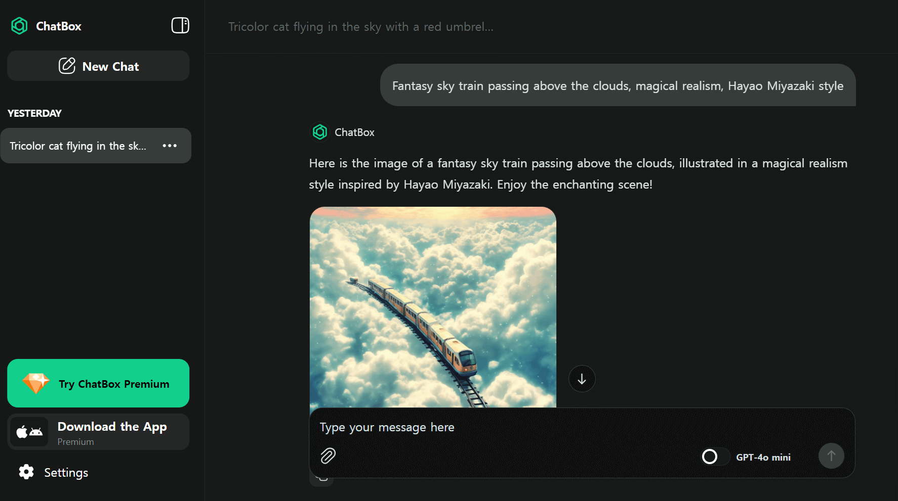 👉 구름 위를 달리는 환상적인 하늘 기차, 마법 같은 분위기, 미야자키 하야오 스타일