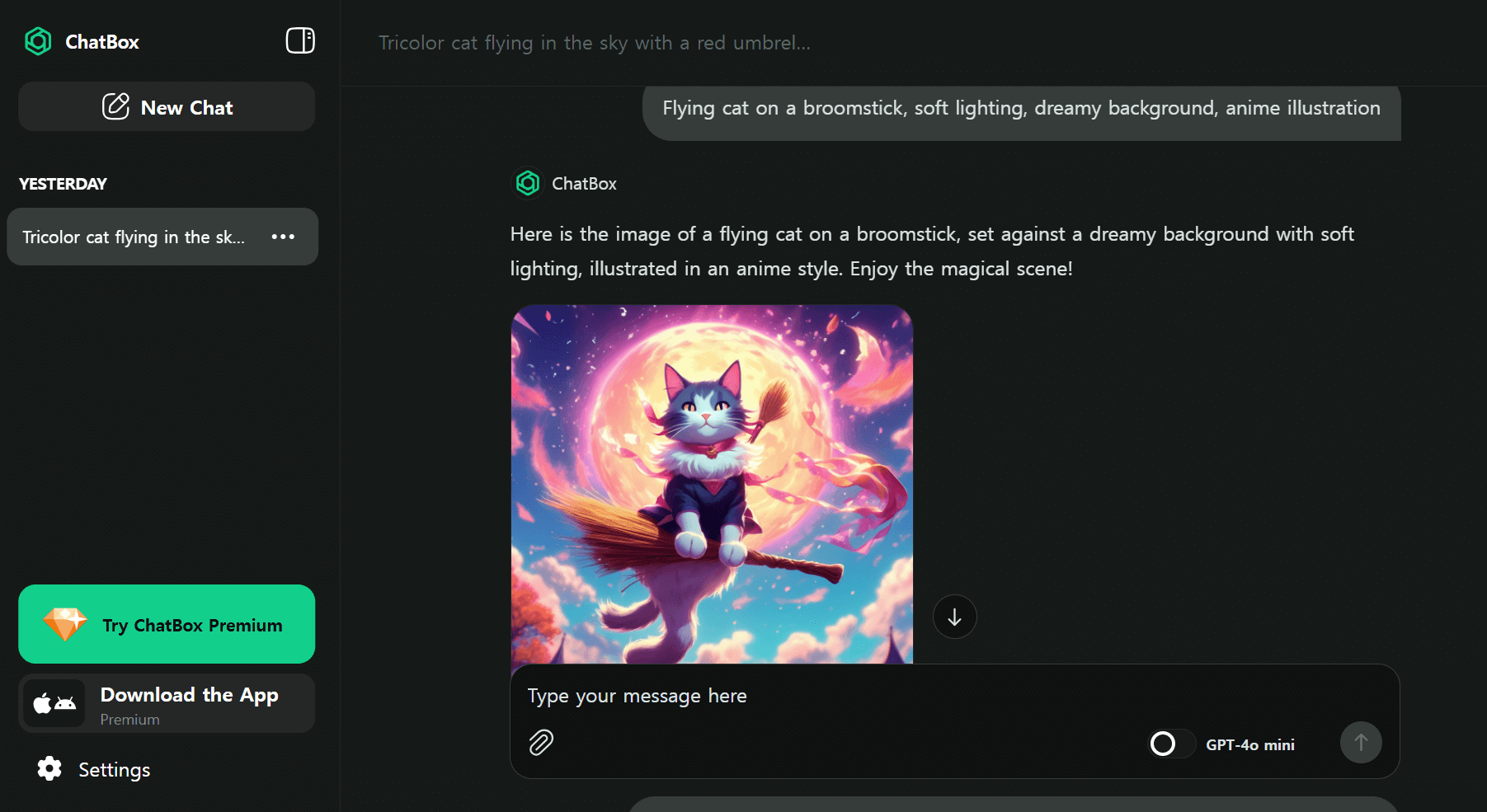 👉 빗자루 타고 나는 고양이, 부드러운 조명, 몽환적인 배경, 애니메이션 일러스트