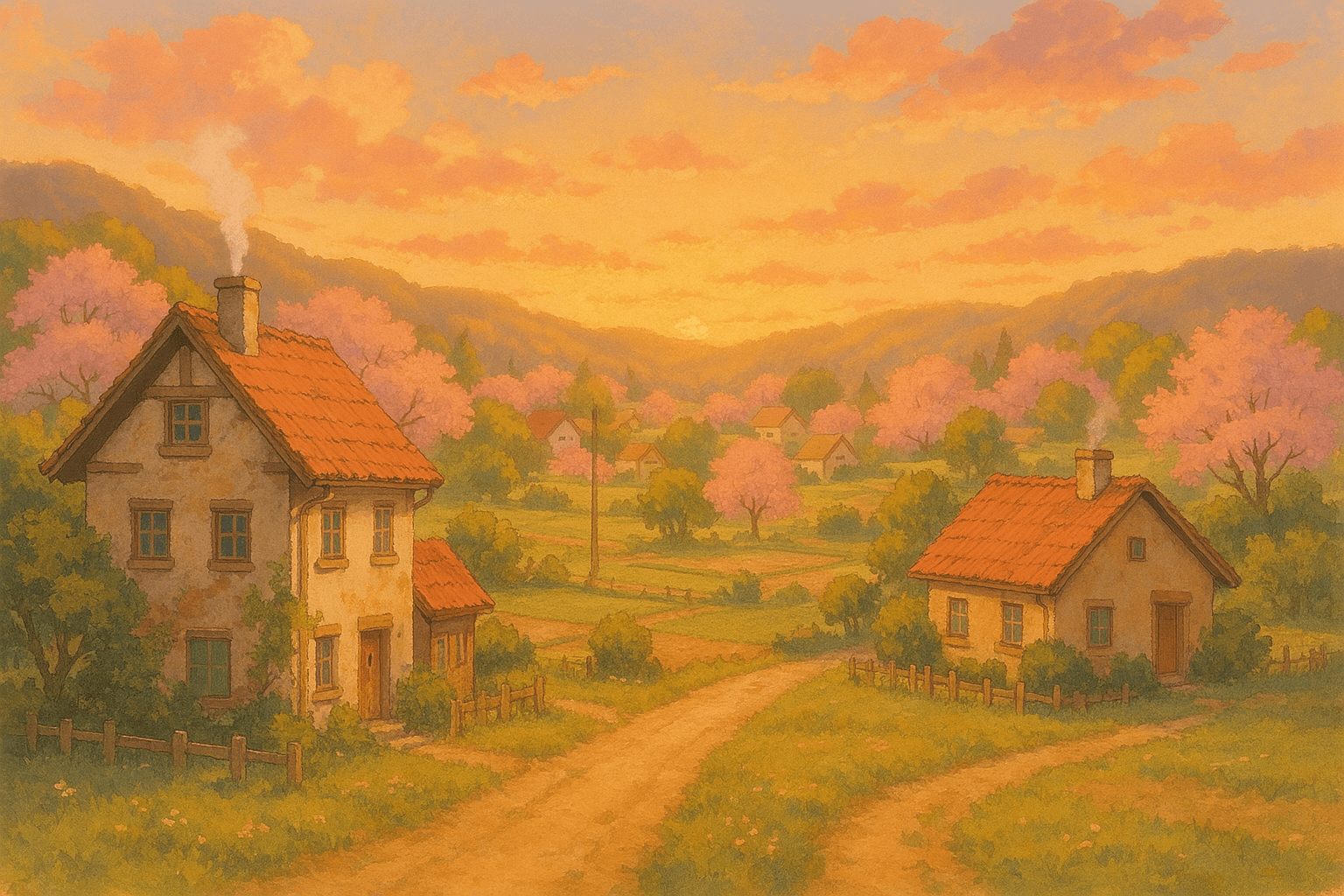 - A cozy village in spring, Studio Ghibli style, warm sunset lighting, soft color palette