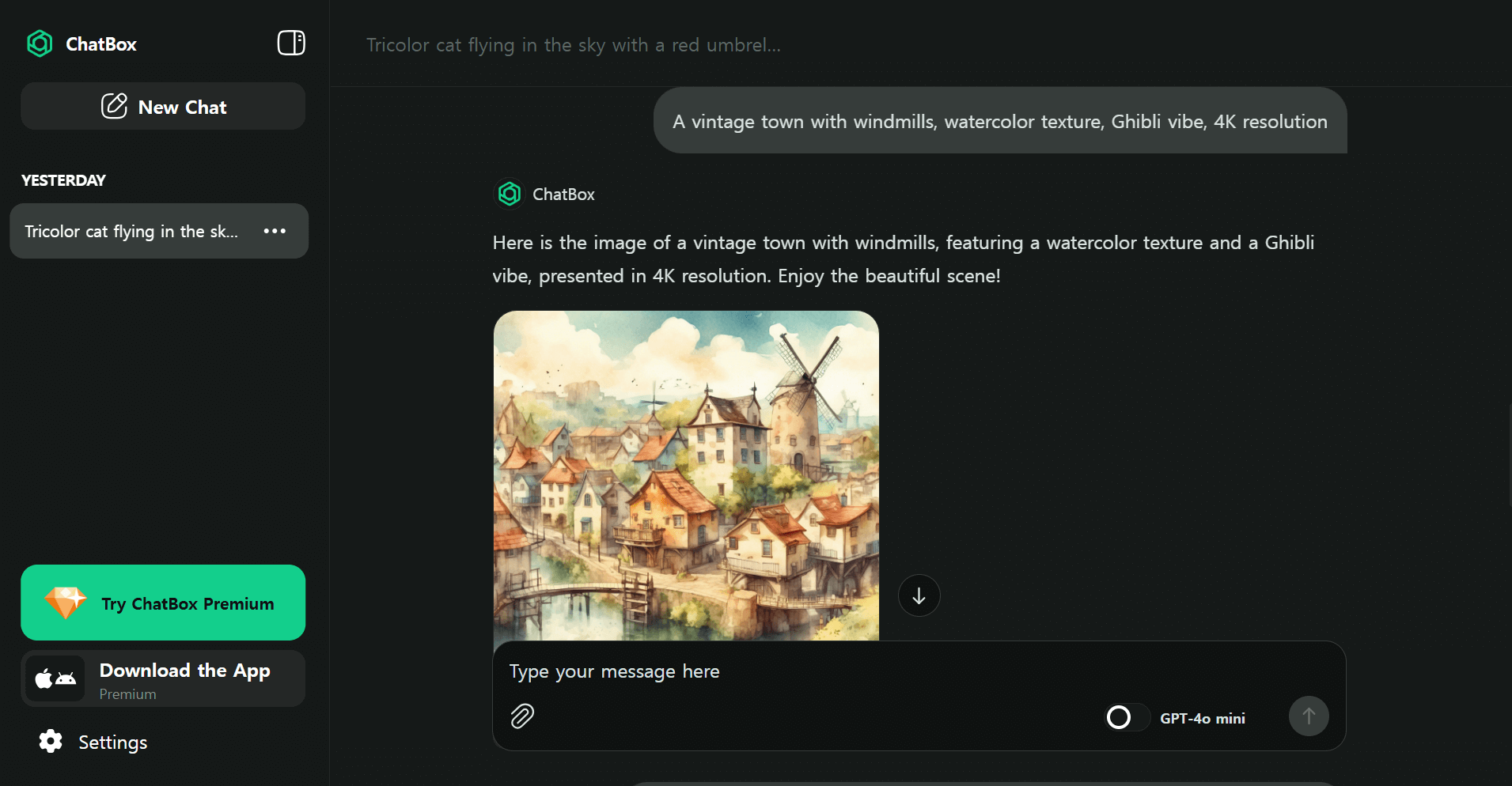 - A vintage town with windmills, watercolor texture, Ghibli vibe, 4K resolution
